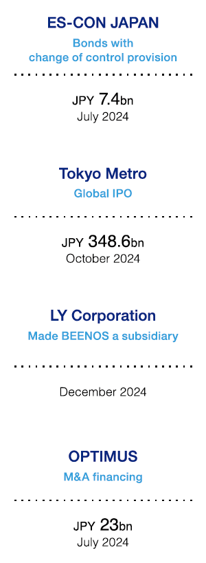 Mizuho Securities has achieved sector–leading performance in equity underwriting operations, serving as a lead underwriter in a number of large finance deals thanks to superior underwriting knowhow and strong equity selling power both in Japan and overseas. We also provide extensive support to companies transitioning from private to public.