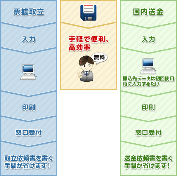 当行はお客さまにフロッピーベースのサービスを用意しております。御利用になると、こんなに便利に!