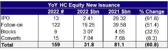 Macro headwinds took their toll on the healthcare sector in 2022 resulting in significantly reduced Equity Capital Markets activity. Hawkish central banks all over the world continue to tighten the liquidity spigot. Their war on inflation saw equity markets taking shrapnel. The S&P is ~20% lower than where it was a year ago. The XBI ETF (Biotech) is ~26% lower than its 2021 closing level. Most private companies chose to remain private leading IPO issuance to drop from $29BN last year to $2.4BN this year. Follow on activity was cut in half –dropping from ~$40BN to $19BN.Most of the follow-on activity was catalyst driven and confidentially de-risked via wall cross. Convertible issuance remained flat year over year at $7BN.