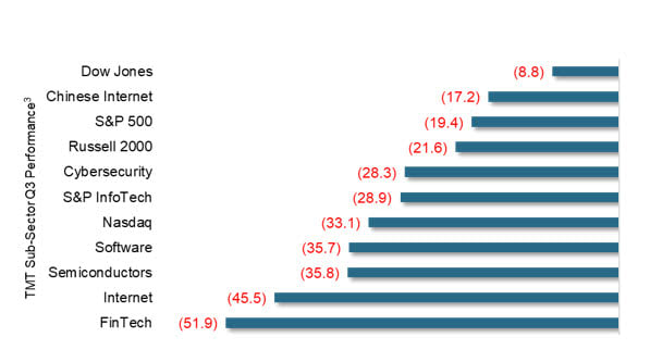 The TMT sector suffered the most from the rising interest rate environment as the majority of sub-sectors significantly underperformed the broader market. As a result, several companies saw valuations halve and even fall below pre-COVID levels. Companies cited a plethora of reasons as to why they missed or slashed forecasts including:
