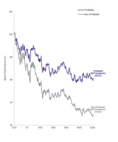 As we have noted previously in this report, the theme of profitability over growth will likely be a major focus going forward in 2023. From 2016 - 2021, growth stocks outperformed value stocks by 45.5%. After a decade-long bull market came to an end in 2022, investors quickly reversed course and deployed more capital into value stocks. As a result, value outperformed growth by 50.2% in 2022. This was also evident in the TMT sector as profitable companies traded at a 32.0% premium relative to non-profitable companies. From a revenue growth perspective, companies growing 30%+ underperformed companies growing less than 10% by (21.6%), largely due to their respective profitability profiles.