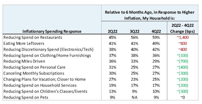 While employment metrics remain strong, the consumer is increasingly facing more uses than sources of cash. Signs of constraint emerged in Q4 around consumer discretionary spending and preferences, as evidenced in the below data gleaned from a Mizuho Equity research survey. In response to inflation, consumers are tightening their belts with discretionary restaurant, food and electronics spending. Notably, respondents indicated they were less willing to cut back on car miles driven, personal care or household and child services relative to other sacrifices.