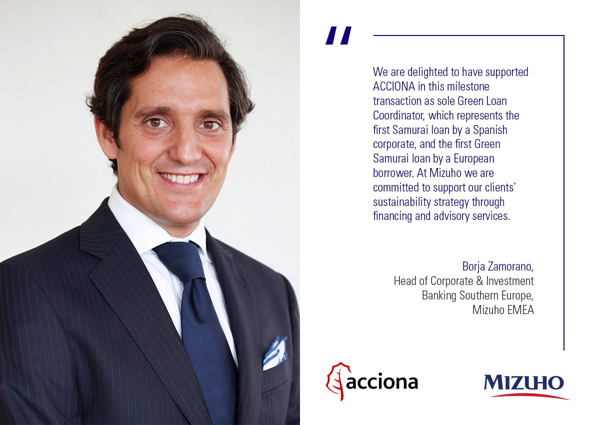 Borja Zamorano, Head of Corporate & Investment Banking Southern Europe, Mizuho EMEA, commented: “We are delighted to have supported ACCIONA in this milestone transaction as sole Green Loan coordinator, which represents the first Samurai loan by a Spanish corporate, and the first Green Samurai loan by a European borrower. At Mizuho we are committed to support our clients’ sustainability strategy through financing and advisory services.”