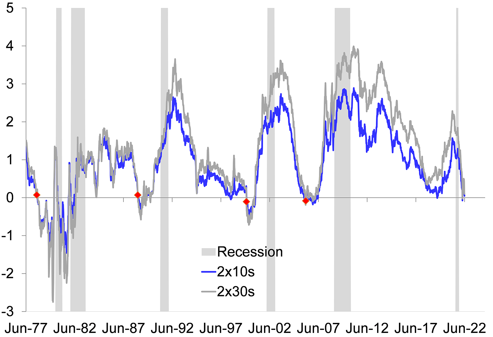The 1979~87 Federal Reserve Chair Paul Volker is famous for removing the punch bowl and squeezing inflation out of the system. It came at a heavy cost in terms of lost output but it was arguably necessary. It was a key component in setting the backdrop for firm growth in the back half of the 1980s and through the 1990s. In recent weeks, recession calls have surged and US equity markets have dropped into bear market territory as inflation continues to surprise on the upside and central banks, not only in the US but elsewhere too have stepped up the pace of policy tightening and rhetoric. Equity bear markets are closely associated with recessions in the US. Of the 8 bear markets for US equities seen since 1970 (excluding the current bear market where the jury is still out), six have happened either just before or concurrently with a US recession. In a mid-2019 article for Project Syndicate, Anatole Kaletsky argued that post-war US recessions were generally caused by one of three things: 1) substantial monetary or fiscal tightening; 2) a financial crisis; or 3) some kind of massive external shock that significantly increased energy prices. Both 1 and 3 are undoubtedly present currently and 3 is exacerbated by food prices running sharply higher too. Food inflation is running around 40-year highs. Another classic recession indicator is the yield curve. The 3mx10yr UST spread is flashing a very different signal from the 2x10yr UST spread, which briefly inverted in early April and is still close to zero. Powell’s recent comments on rate hikes at his semi-annual testimony suggests it will not be long before the signals merge. Powell noted “Financial conditions have tightened and priced in a string of rate increases and that’s appropriate…We need to go ahead and have them”. The 3mx2yr spread will narrow sharply in coming months, especially if the Fed sticks to 75bp hikes, as seems likely at least for July. The NY Fed’s DSGE model updated in mid-June now sees a soft landing (growth staying positive over the next 10 quarters) as just a 10% probability, while the probability of recession is (at least 1 quarter in the next 10 where YoY growth dips below -1.0%) is around 80%.