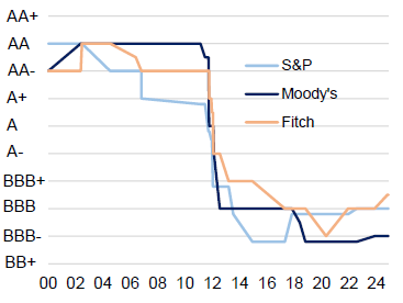 The main risk we see for the Italian economy comes from Trump’s policies. According to 2023 figures, Italy exports around 10.7% of their total exports to the US (vs 9.4% for Germany, 8.3% for France, and 5.6% for Spain). Even with this risk on the table, we think conditions are pointing to a catch-up of Moody’s (22nd Nov) with the other rating agencies and a change in their Italian long-term debt outlook to Baa3 positive. Italy has shown some evidence of getting round the political challenges and the commitment to consolidate their debt may be enough to secure a better outlook, which is also in line with how optimistic markets are on Italy.