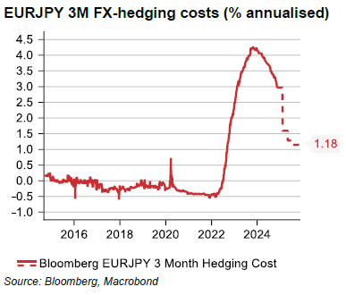 Higher hedging costs have made most overseas rates products look unattractive to Japanese investors, who like to buy long-term foreign bonds with an FX hedge. However, with the ECB looking to cut policy rates while the BoJ continues with their hiking cycle, we foresee a notable decrease in EURJPY FX-hedging costs that will ultimately drive a shift in how Japanese investors look at EGBs. The below forecasts are made using current FX fwd points, but bear in mind that we hold a more dovish view on ECB (1.50% terminal) and a more hawkish view in the BoJ (1.0% terminal) vs what the market is pricing, meaning that we may see an even more pronounced decrease in 3M FX-hedging costs for Japanese investors that buy EUR (towards below 1.0% annualized).