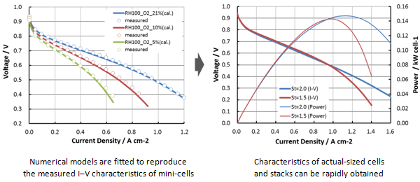 Because internal phenomena in fuel cells are related to multiple physics aspects, computational costs for their simulation tend to be high using general CAE software. P-Stack® rapidly simulates the performance and internal states of full-scale fuel cells and stacks. A drastic reduction of computational costs is achieved by well-validated numerical models such as the MEA model, which reproduce measured I–V characteristics.