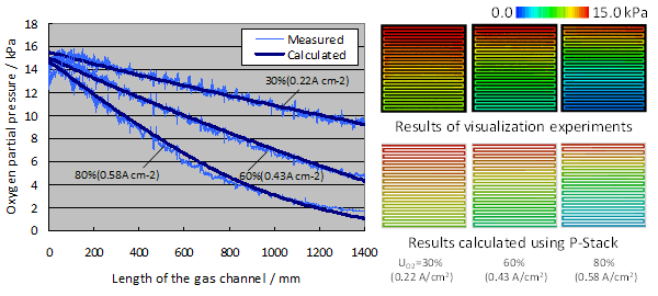 Numerical models in P-Stack well reproduce not only the I–V curve but also various internal states. The figures on the right hand side present a comparison of the measured and calculated oxygen partial pressure distributions in a cathode channel under different utilization ratios UO2. The calculated results are in good agreement with the measured data for all UO2 cases. Oxygen is consumed almost constantly in low-UO2 condition, while a relatively faster consumption of oxygen is observed in the upper-flow region for UO2 = 80%. These behaviors are also well reproduced by P-Stack. These results indicate that the MEA model in P-Stack can quantitatively estimate oxygen consumption owing to the ORR reaction.