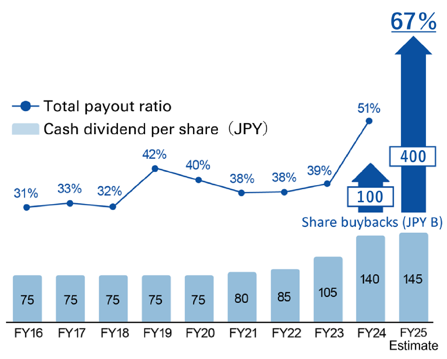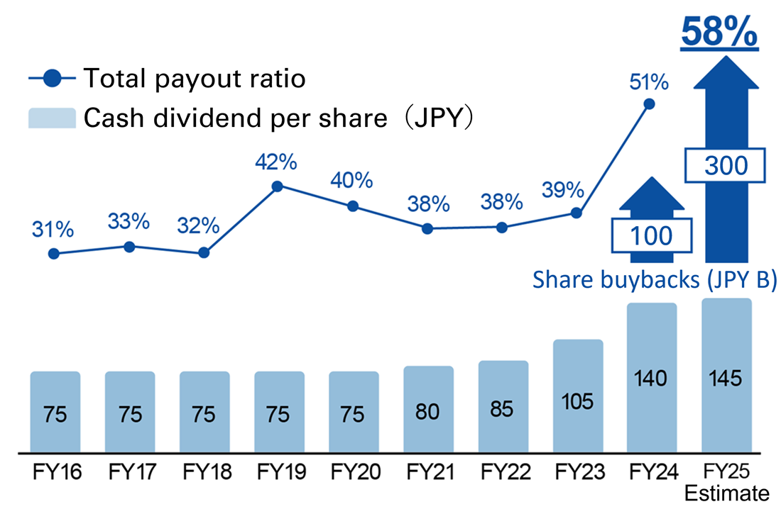 Forecast of annual Cash Dividend per Share for FY25 is JPY 145.00, an increase of JPY 5.00 compared to FY24. This will be the fifth consecutive year to increase dividends, backed by solid growth of stable earnings foundation. This remains unchanged from our initial forecast announced in May 2025. Additionally, share buybacks were resolved up to a maximum of JPY 100 billion on May 15, 2025, and up to a maximum of JPY 200 billion on November 14, 2025, bringing the total for FY25 to JPY 300 billion.