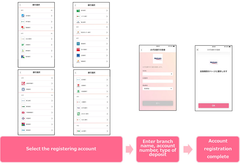 A customer can link a deposit account at a participating financial institution with J–Coin Pay by downloading the J–Coin Pay app, selecting the appropriate bank, inputting the account number and other necessary information, and confirming their identity.