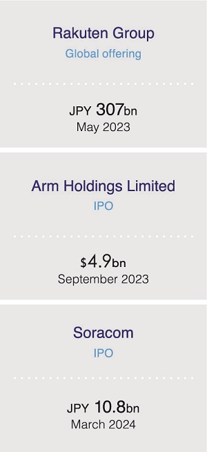 Mizuho Securities has achieved sector–leading performance in equity underwriting operations, serving as a lead underwriter in a number of large finance deals thanks to superior underwriting knowhow and strong equity selling power both in Japan and overseas. We also provide extensive support to companies transitioning from private to public.