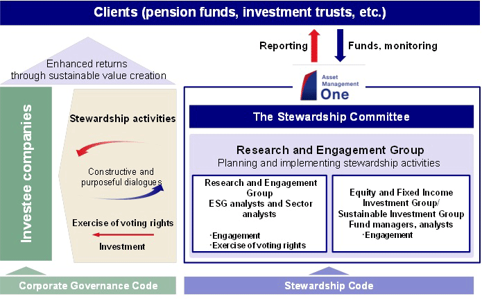 At the same time that Asset Management One, which is the Mizuho group company responsible for asset management, began operations in October 2016, we newly established our Responsible Investing Department (currently Research and Engagement Group) and proceeded with initiatives for active engagement in discussions with our investee companies regarding environmental, social, and corporate governance (ESG) issues and exercise of proxy voting rights.