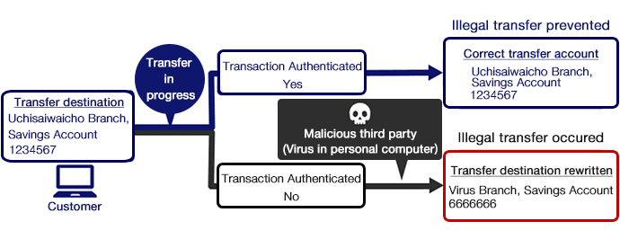 When you enter the account number of the transfer destination using the dedicated card or smart phone app, a one–time password will be issued. This one–time password and the transfer account number are linked, and confirmation of the transfer destination is achieved when specified by the customer. Illegal remittance due to illegal rewriting of the transfer destination or account information can be prevented.
