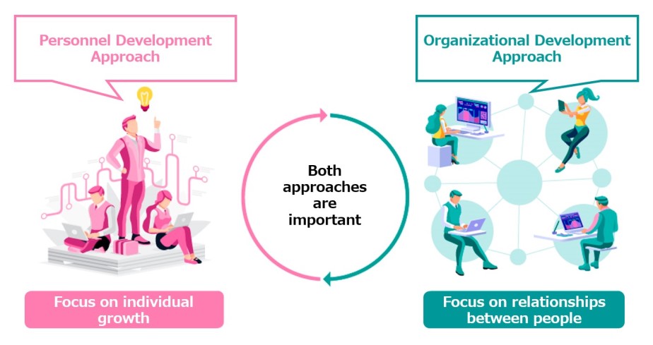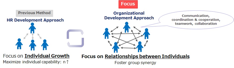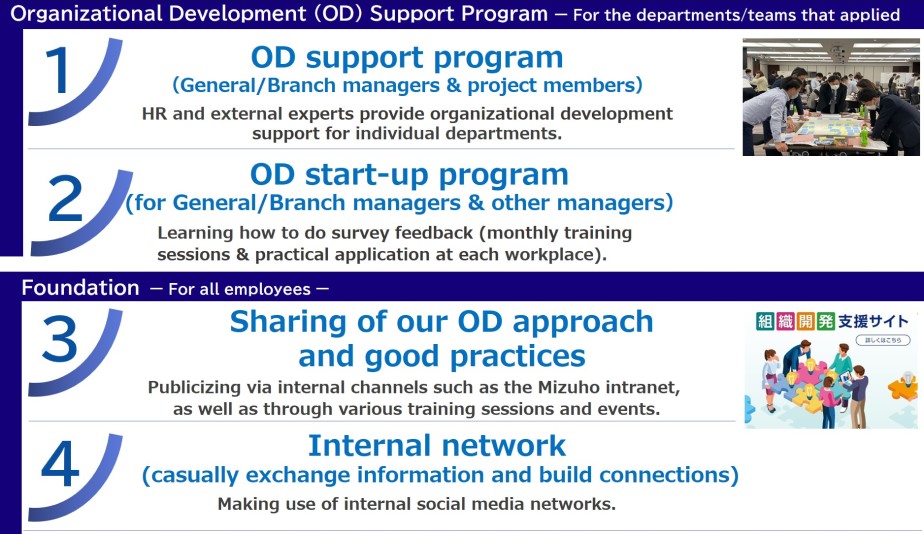 In addition to the personnel development approach that supports the growth of individual employees, we at Mizuho are emphasizing an organizational development approach to increase employee engagement and performance throughout the organization by encouraging interpersonal relationships for further improvement of all internal collaborative processes.