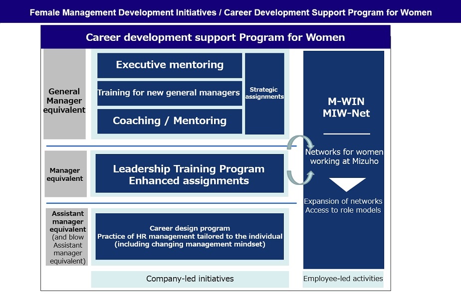 Mizuho maintains the MIW–NET, an employee resource group created to nurture and support younger generations centered on female managers working at Mizuho and the Mizuho Women's Initiatives Network (M–WIN), founded with the aim of enhancing connectivity between women working at Mizuho, also plays an important role in encouraging the growth and involvement of all women at Mizuho, through sharing diverse ideas and perspectives. For more details, see Employee connectivity.