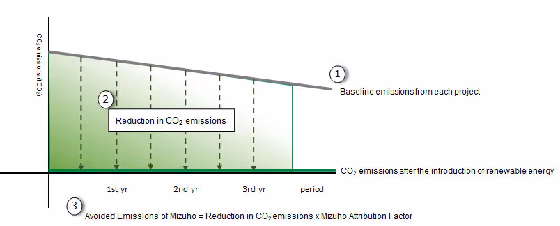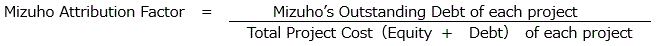 Mizuho adopts the concept of Avoided Emissions under the PCAF Standard for the purpose of measuring the reduction in emissions from our project finance portfolio. This calculation is based on the emission factor of the fossil fuel that has the largest impact on the power generation mix in the project region and CO2 emission reductions contributed by the renewable power projects that Mizuho finance. The above Mizuho Attribution Factor is used for calculating CO2 avoided emissions in line with PCAF Standard.