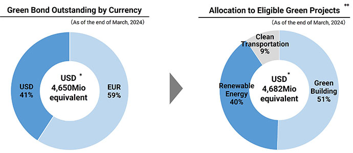 Green bonds are bonds in which the proceeds are used solely for the purpose of providing finance for environment–friendly projects (hereinafter "Green Projects") such as renewable energy and energy-saving business, etc. Mizuho Financial Group (hereinafter "MHFG") issues green bond to promote green finance.