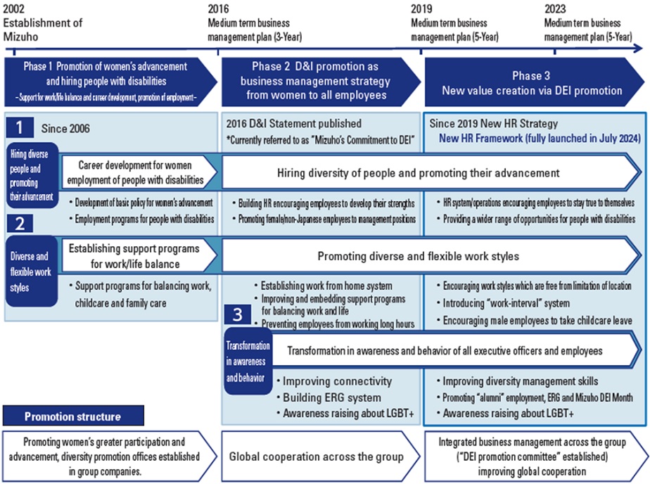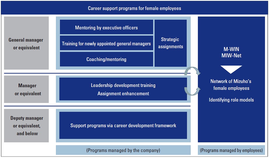 We are focusing on activities to hire more new female graduates to establish a foundation for women to thrive in the medium and long term. To communicate the benefits of working at Mizuho, we enriched the content on our online recruiting pages to introduce role models and provide information on Mizuho's organization and systems. We also hold roundtable discussions for women prior to joining Mizuho, where they can have real interactions with our employees and gain a better understanding of the company's appeal and work environment.
