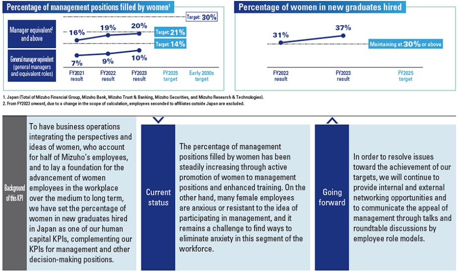 Companies in Japan are required to promote more active roles for women in the workplace under the Act on the Promotion of Women's Active Engagement in Professional Life. Mizuho is continuing to focus on the provision of stretch assignments and enhancement of networking to reach a ratio of 30% female managers by the early 2030s. In FY2024, we laid the groundwork so we can implement systematic, data-driven measures by visualizing employee data by organization, sharing issues among management, and strengthening alignment between business divisions and the HR division. We are also steadily increasing the percentage of new female graduates hired, which is an important indicator for the long-term promotion of the development and advancement of female employees.