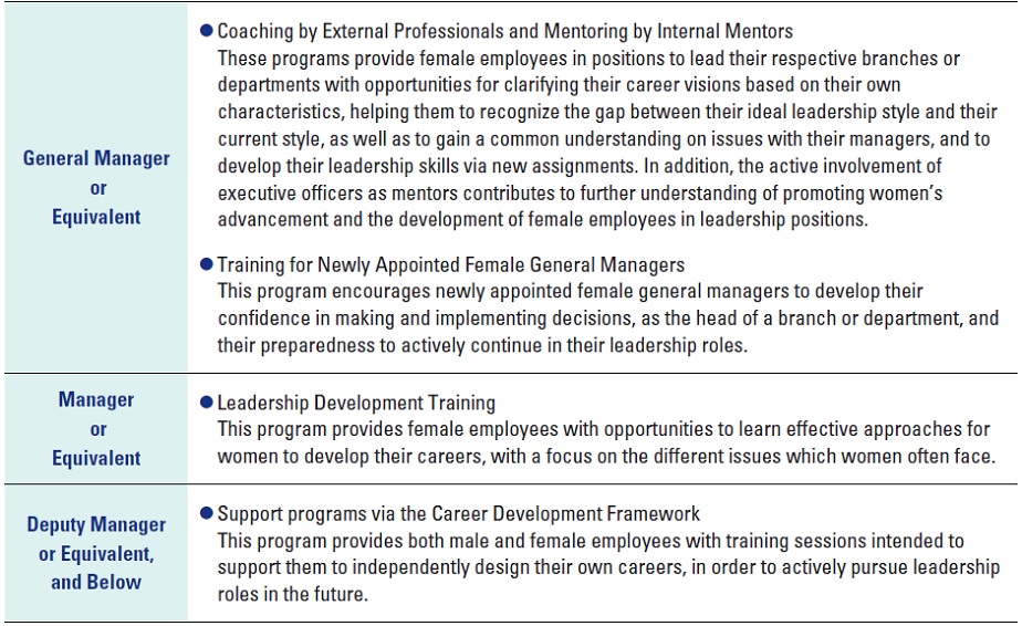 Fine-grained support tailored to women's issues at different stages of life is necessary in order for women to manifest all their abilities and feel a sense of fulfillment and pride in their work while achieving a balance between work and private life. We launched career support programs for female employees in FY2016 as part of these support efforts.