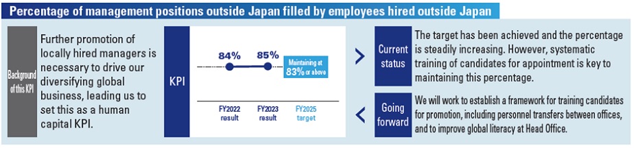 In order to maintain and improve the percentage of local hires in management positions outside Japan, we have established training programs and succession plans for local hires outside Japan, and we conduct training for senior executives in collaboration with management at the head office in Japan. At the same time, we promote placing Japanese employees with work experience in posts outside Japan that require handling global issues in order to enhance the global responsiveness of the head office in Japan.