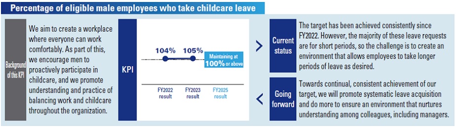 We hold information sessions for all employees and seminars led by outside experts for employees who have had children, those seeking childcare leave, and managers to learn about the significance of men taking childcare leave. We also send congratulatory emails to employees who have had children and their managers, among other initiatives to encourage male employees to participate in childcare. Additionally, we strive to address concerns that may dissuade men from taking advantage of childcare leave by introducing role models and sharing other information. To further encourage male employees to participate more in childcare, we recommend that male employees take one month or more of leave or leave of absence for childcare purposes in line with a policy established in July 2024 that male employees in general should take a minimum of 10 days for childcare. In conjunction with this, we hold information sessions to promote employee understanding, have established the Parental Leave Manual for Men, and have enhanced efforts to create environments in which men can confidently take leave for childcare by sharing information on leave status with department / branch managers. By encouraging men to take an active role in childcare, we aim to drive attitude and behavioral changes related to work style reforms, operational efficiency, and corporate culture transformation. This, in turn, helps foster workplaces where everyone can achieve a career that aligns with their individual values and aspirations.