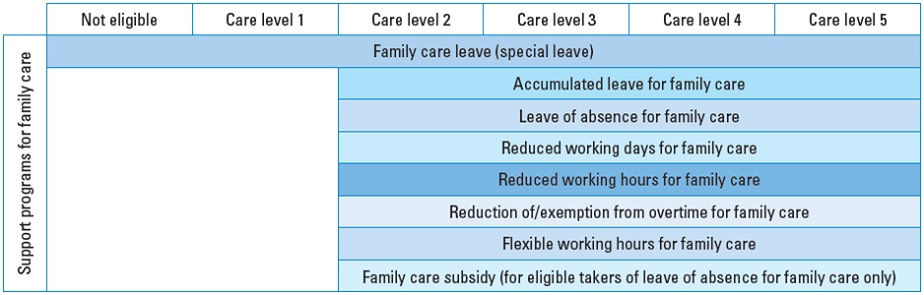 No employees quitting the company due to family care responsibilities". The programs include family care leave exceeding legal requirements, reduced/flexible working hours for family care and seminars and manuals designed to relieve worry and anxiety.