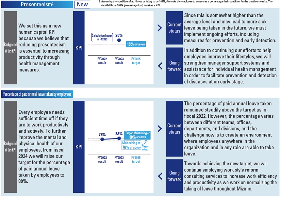 Mizuho will strategically promote health and productivity management, aiming to create an environment in which a diverse range of employees can work in a lively manner and to leverage the strengths and personalities of all employees by increasing their motivation and productivity, making them drivers of corporate value enhancement and sustainable growth.
