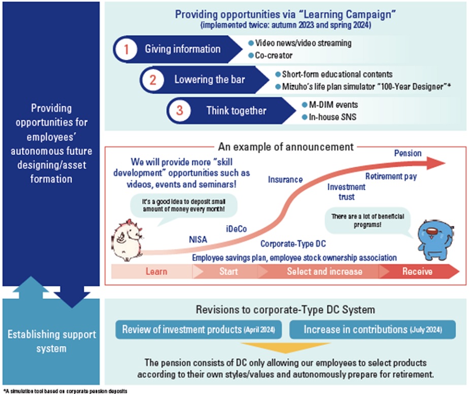 In addition to physical and mental health and wellness, Mizuho focuses on financial wellness, to eliminate our employees' future financial concerns so they can work with peace of mind. In FY2023, we concentrated on creating motivation for independent asset building through awareness-raising campaigns. In FY2024, we engaged with employees with significant interest in and understanding of building assets, with active encouragement from their departments and support tailored to their individual circumstances. We held talk events at branches and offices upon request and presented information based on the needs of motivated employees. We have confirmed that these initiatives have led to employees taking actual steps toward self-directed asset formation. We will continue to measure the effectiveness of these efforts while pursuing greater financial wellness for our employees.