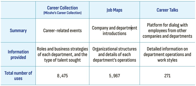 In order for our employees to take concrete action toward building careers that align with their individual aspirations, it is important for them to understand what opportunities for growth are available at Mizuho and to consider what they want to achieve. Across our five core group companies, we provide tools and opportunities for our employees to consider their careers together with Mizuho and three programs to understand what opportunities are available for them. The programs appear to be widely used, having reached 6,000 users, but this figure represents just over 10 percent of all of our employees. To encourage greater use of the programs, we are working to enrich the programs' content, improve their usability, and promote awareness of the programs.