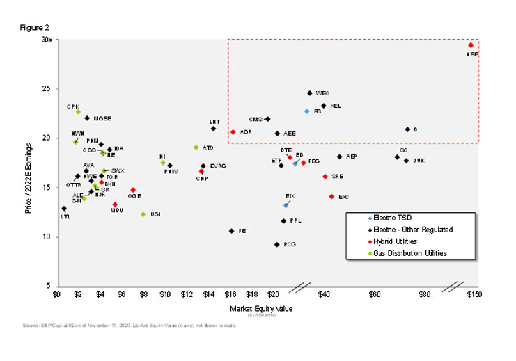 Mind the (Valuation) Gap! Today, the valuation discrepancy is quite significant and has major implications on strategic direction and cost of capital, not to mention on end-user rates. In Figure 2 above, the valuation differential by investors' views on the prospects for individual utilities is readily evident with market cap on the “x-axis” and P/E ratio on the ‘y-axis.” The spread in valuation multiples is at historically wide levels.