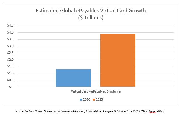Virtual cards, also known as ePayables, are quickly becoming an alternative to checks and ACH in the accounts payables process. For those organizations that struggled with a lack of access to online banking systems, or even the modest checkbook during the initial months of the 2020/2021 pandemic, virtual cards became a simple alternative to keep the supply chain functioning. Virtual cards are digitally generated commercial cards that do not require the issuance of a plastic card and can be configured for single-use or dedicated to a particular supplier, even funded only for a particular payment, making them extremely safe and secure. Use of these card rails for post invoice B-to-B payments is expected to triple over the next 5 years, from an estimated $1.3 trillion in 2020 to an estimated $3.9 trillion in 2025, according Juniper Research.
