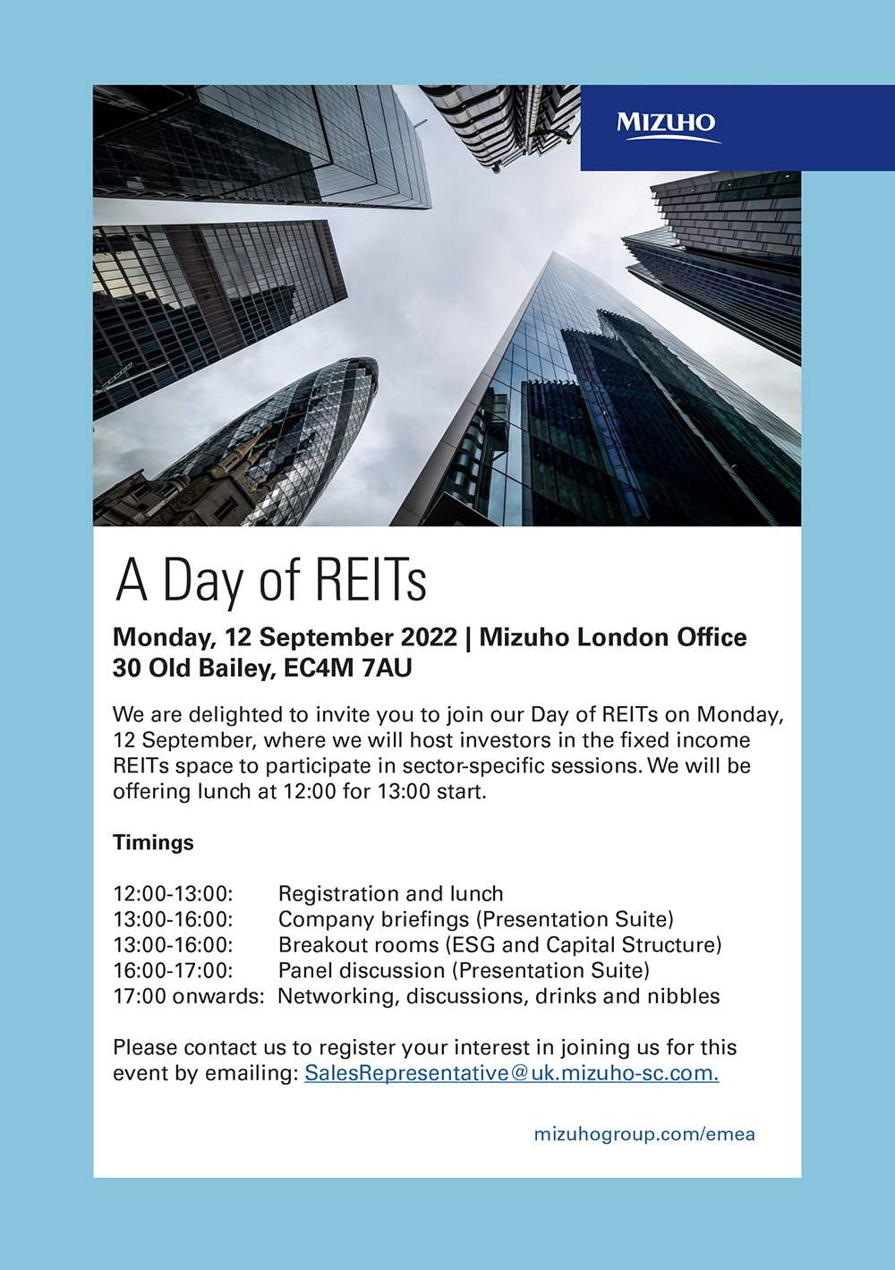 We are delighted to invite you to join our Day of REITs on Monday,12 September, 2022. For those who are unable to attend in-person, we are offering the option to attend virtually. Please see below for more details.